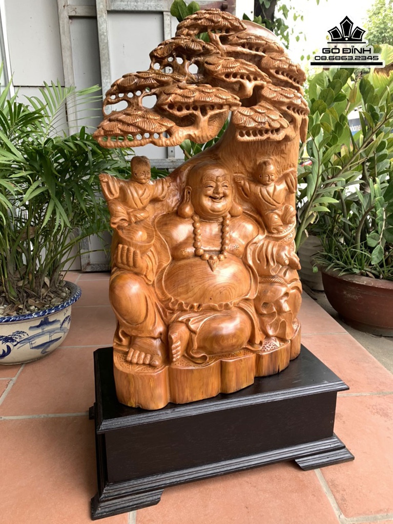 Tượng Di Lặc Ngồi Gốc Tùng Gỗ Ngọc Am Liền Khối