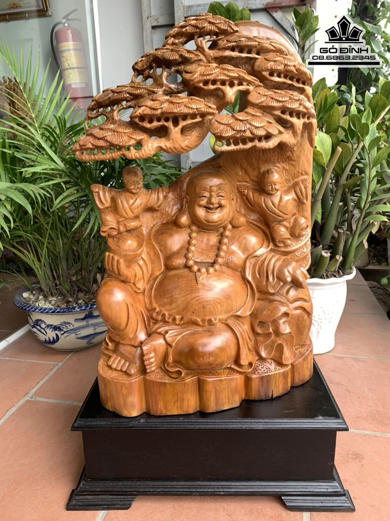 Tượng Di Lặc Ngồi Gốc Tùng Gỗ Ngọc Am Liền Khối Cao 67 Ngang 50 Sâu 30 Cả Kỷ 97 (cm)