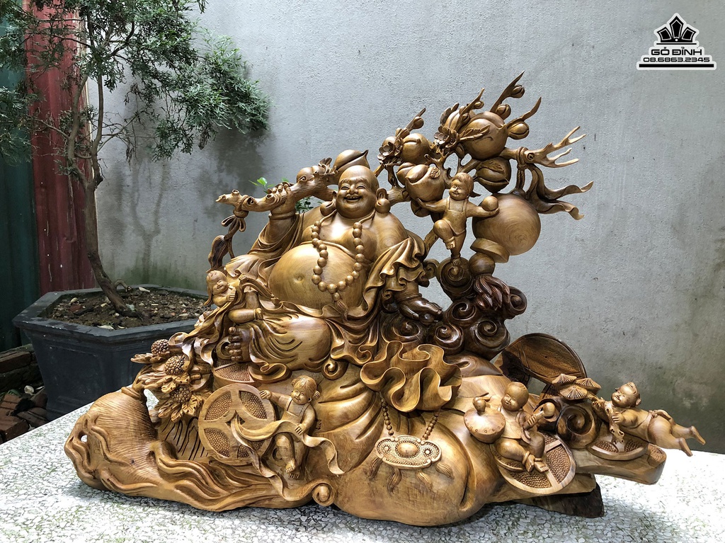 Tượng Di Lặc Ngũ Phúc Gỗ Bách Xanh Cao 60 Ngang 82 Sâu 32 (cm)
