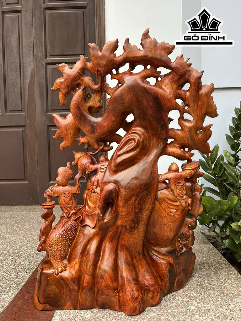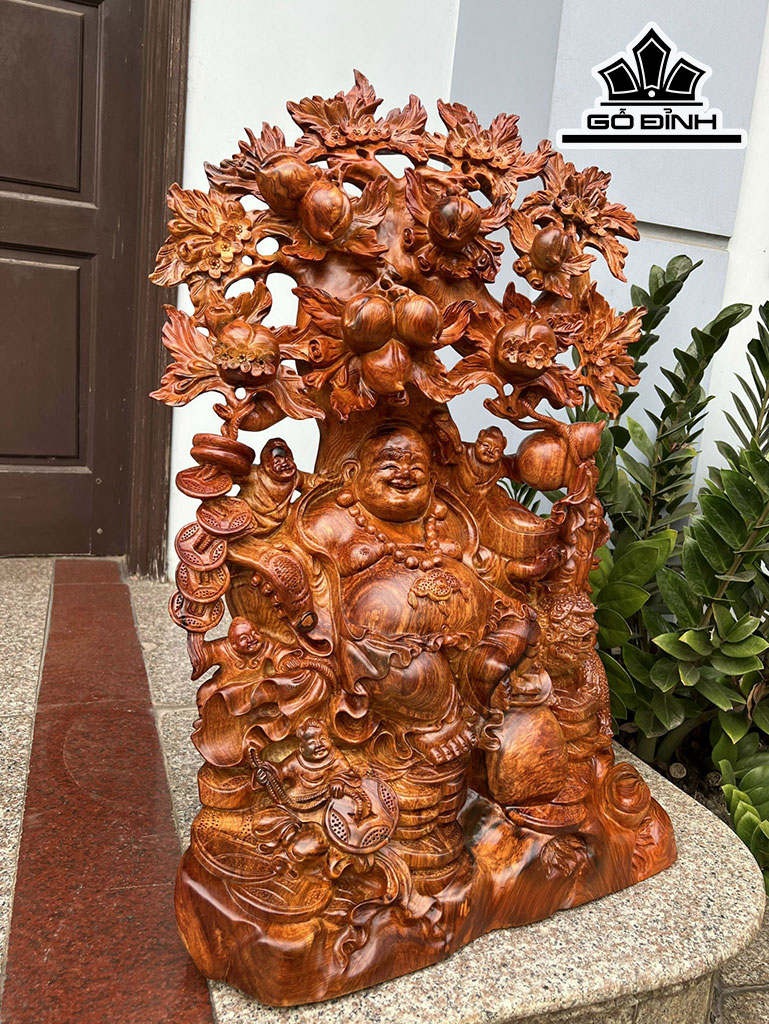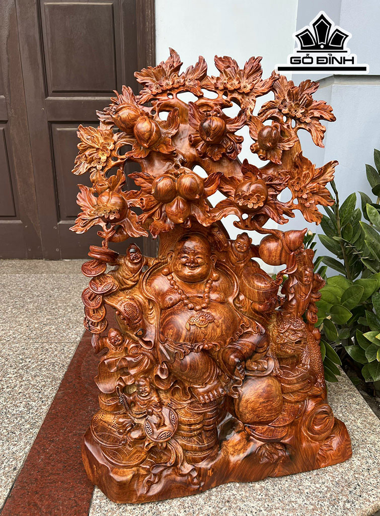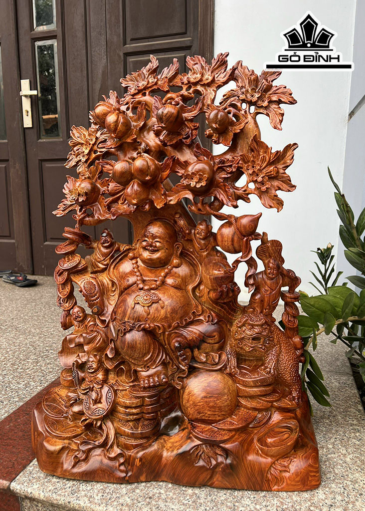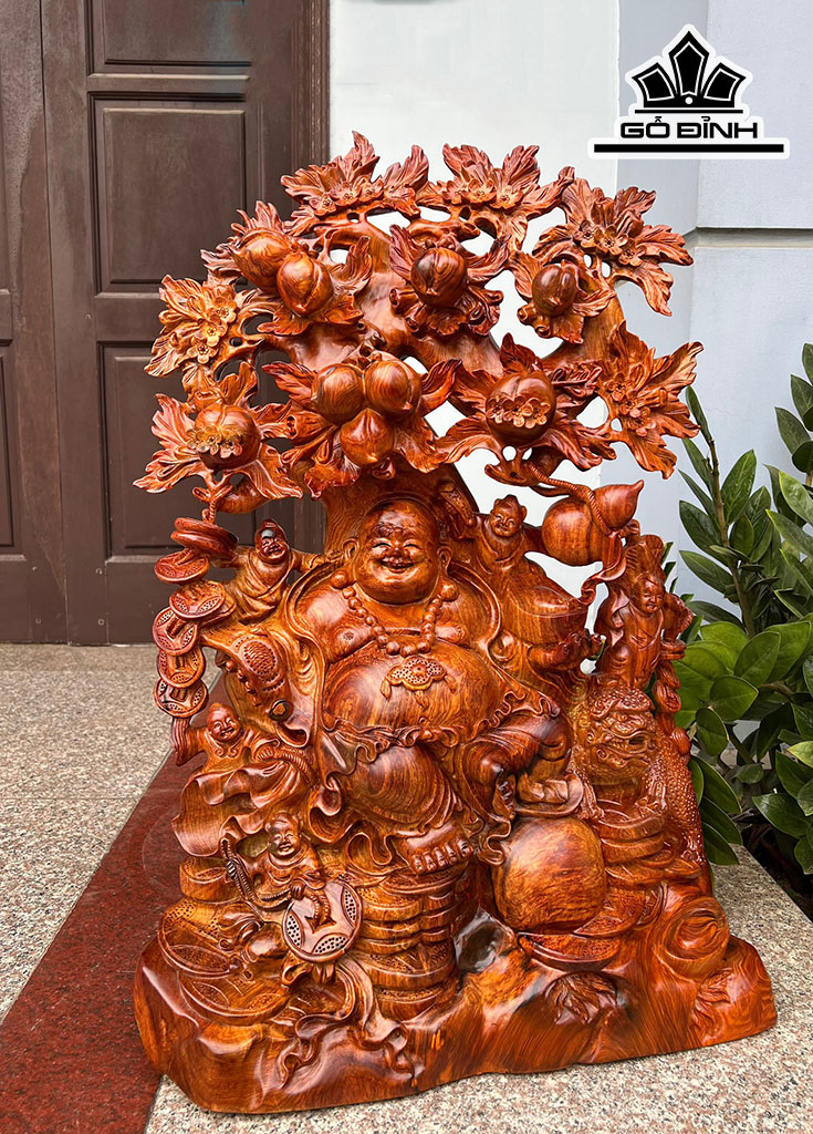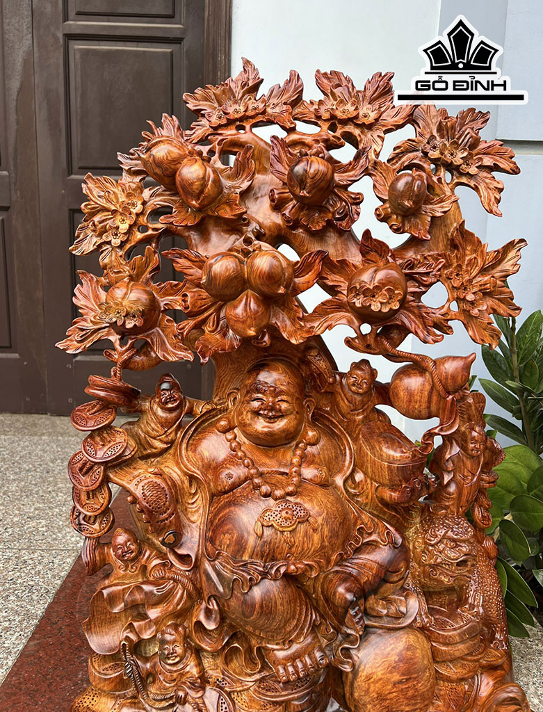 Tượng Di Lặc Ngũ Phúc Ngồi Gốc Đào Gỗ Cẩm Cao 79 Ngang 54 Sâu 31 (cm)