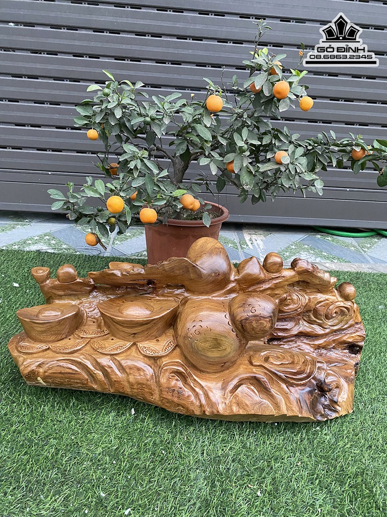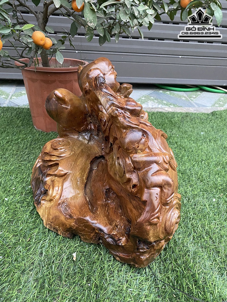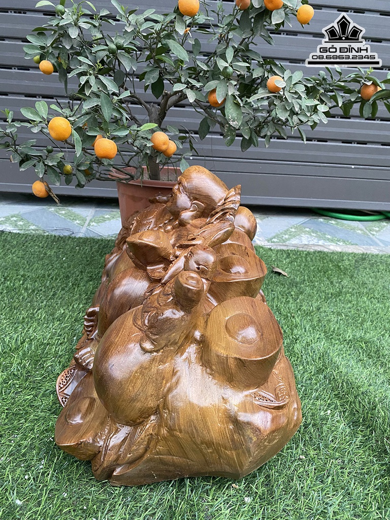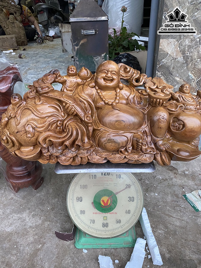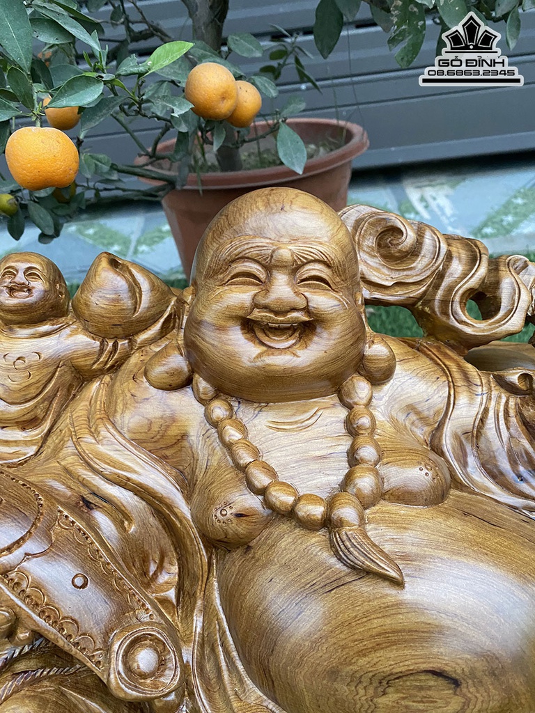 Tượng Di Lặc Tam Phúc Gỗ Bách Xanh Nguyên Khối Cao 30 Ngang 58 Sâu 29 (cm)