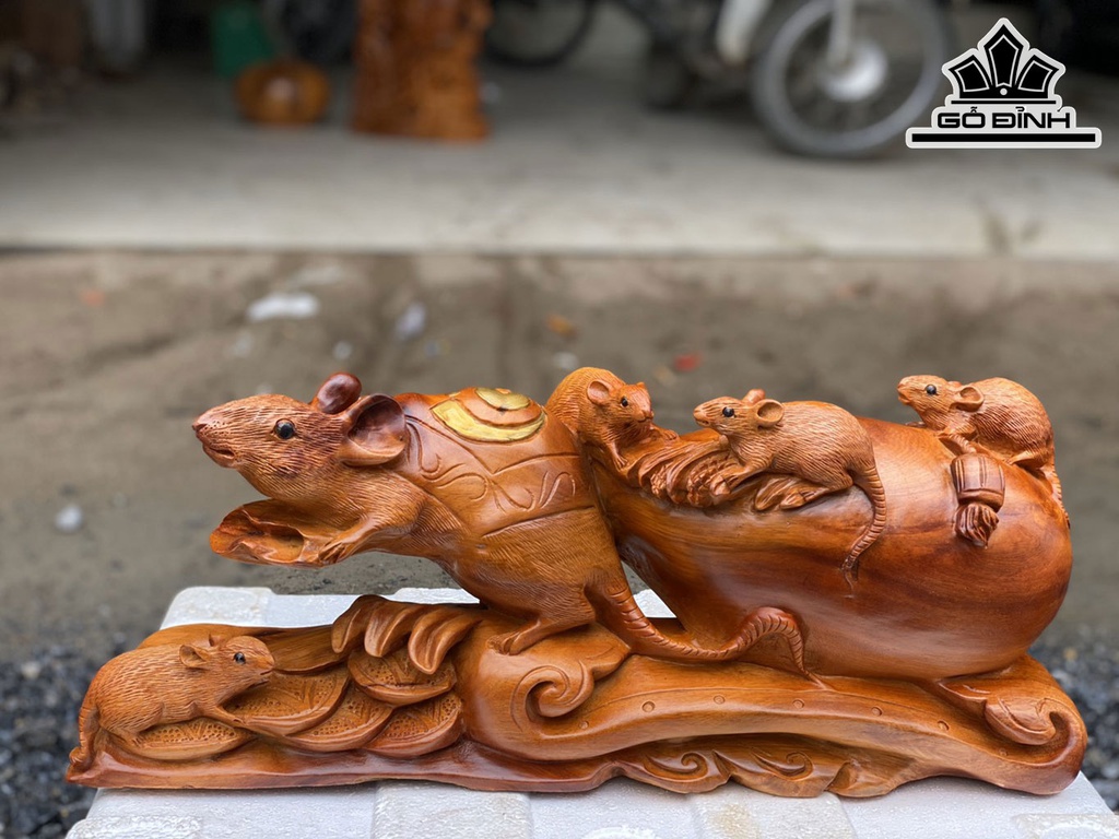 Tượng Gia Đình Chuột Kéo Bao Tiền Gỗ Hương Cao 21 Ngang 52 Sâu 12 (cm)