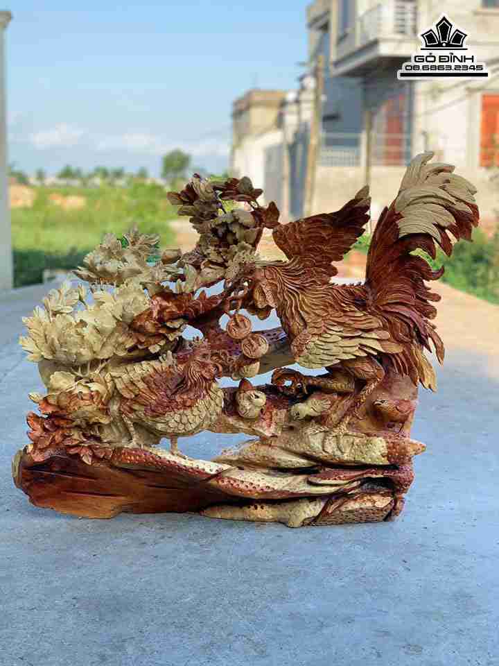 Tượng Gia Đình Gà Gỗ Hương Cao 74 Ngang 82 Sâu 38 (cm)