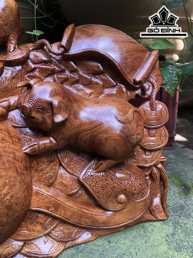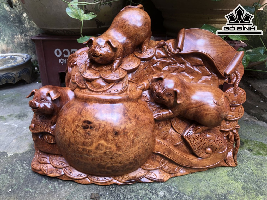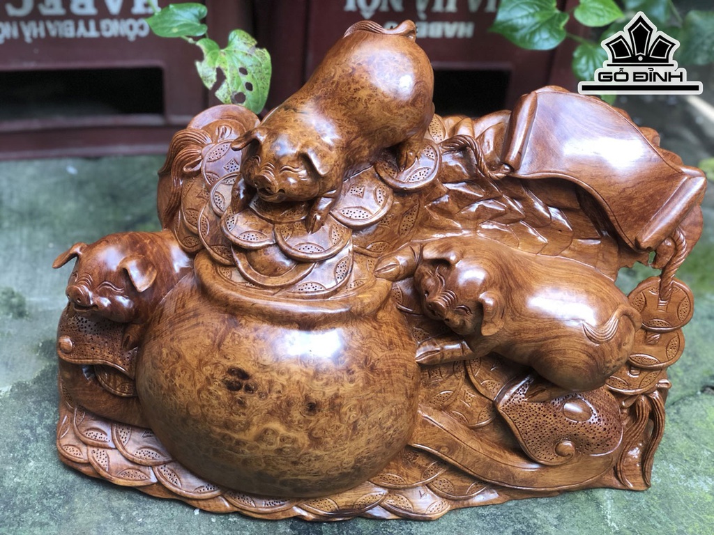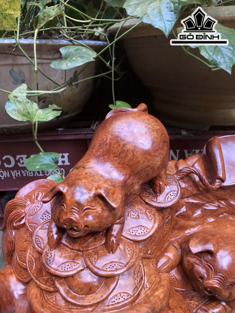 Tượng Gia Đình Heo Gỗ Hương Cao 38 Ngang 52 Sâu 20 (cm)