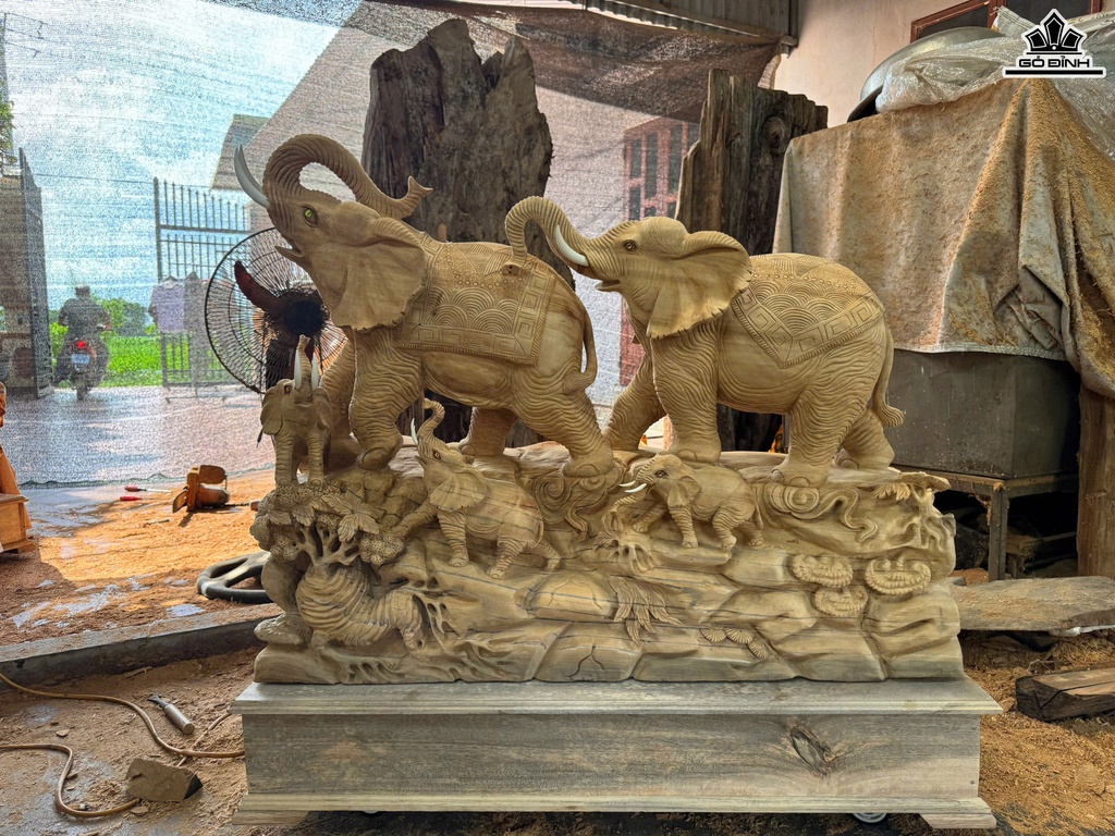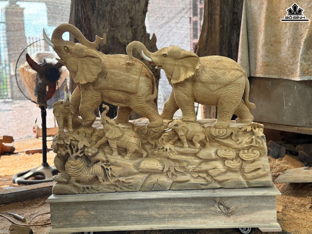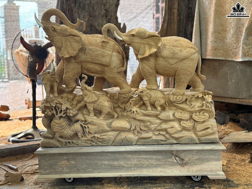 Tượng Gia Đình Voi Gỗ Ngọc Am Cao 85 Ngang 100 Sâu 33 (cm) - Cả Kỷ Cao 103 ( cm)