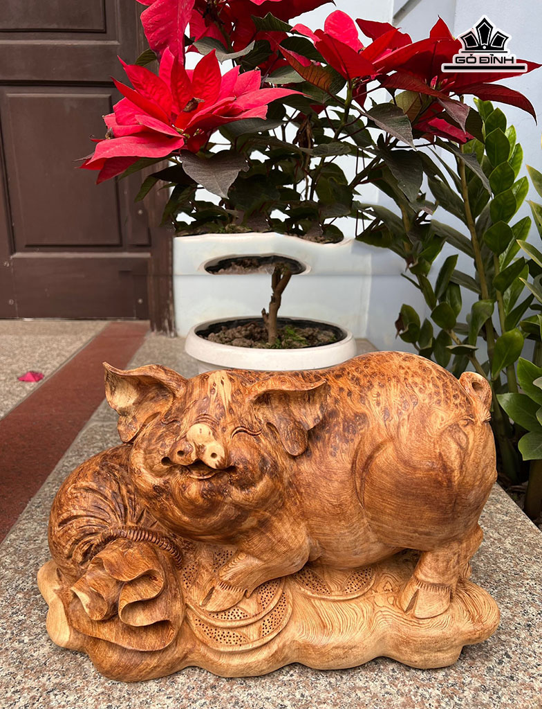 Tượng Heo Nằm Tiền Vàng Gỗ Nu Ngọc Am Cao 25 Ngang 43 Sâu 23 (cm)