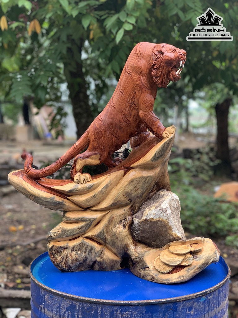 Tượng Hổ Gỗ Hương Ôm Đá Cao 64 Ngang 62 Sâu 26 (cm)