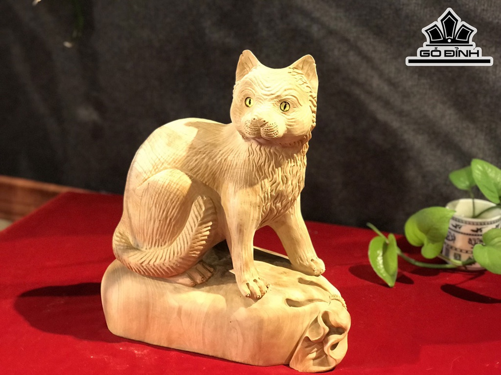 Tượng Mèo Ngồi Bao Tiền Vàng Gỗ Ngọc Am Cao 34 Ngang 30 Sâu 15 (cm)