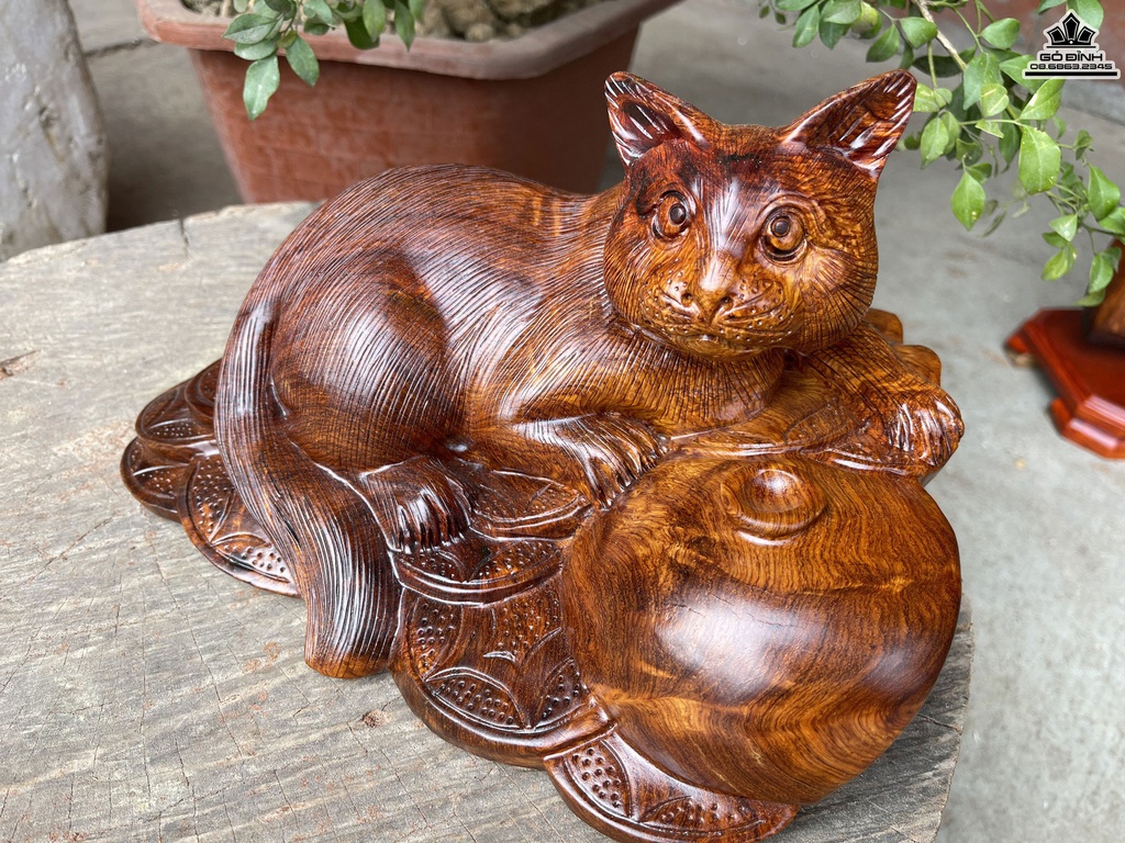 Tượng Mèo Phong Thủy Gỗ Hương Cao 15 Ngang 25 Sâu 19 (cm)