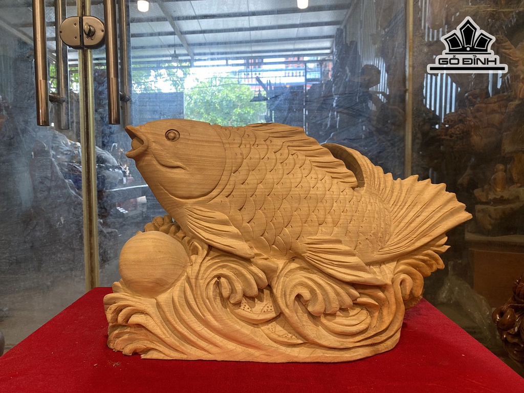 Tượng Nhất Ngư Vờn Ngọc Gỗ Ngọc Am Cao 30 Ngang 50 Sâu 15 (cm)