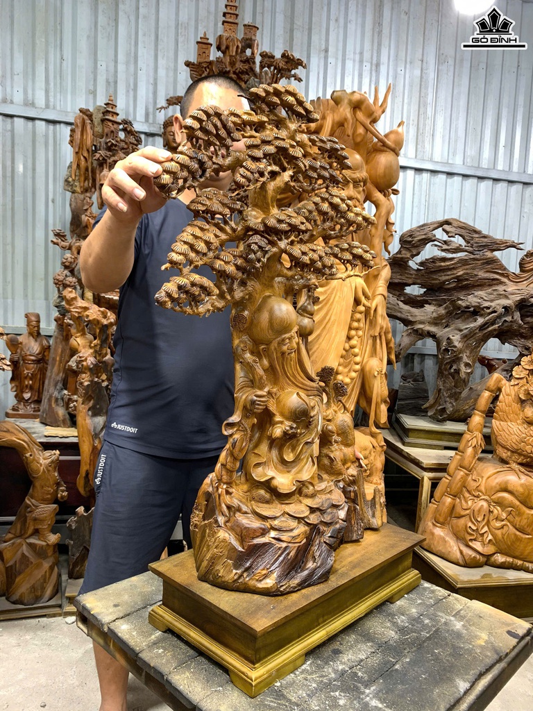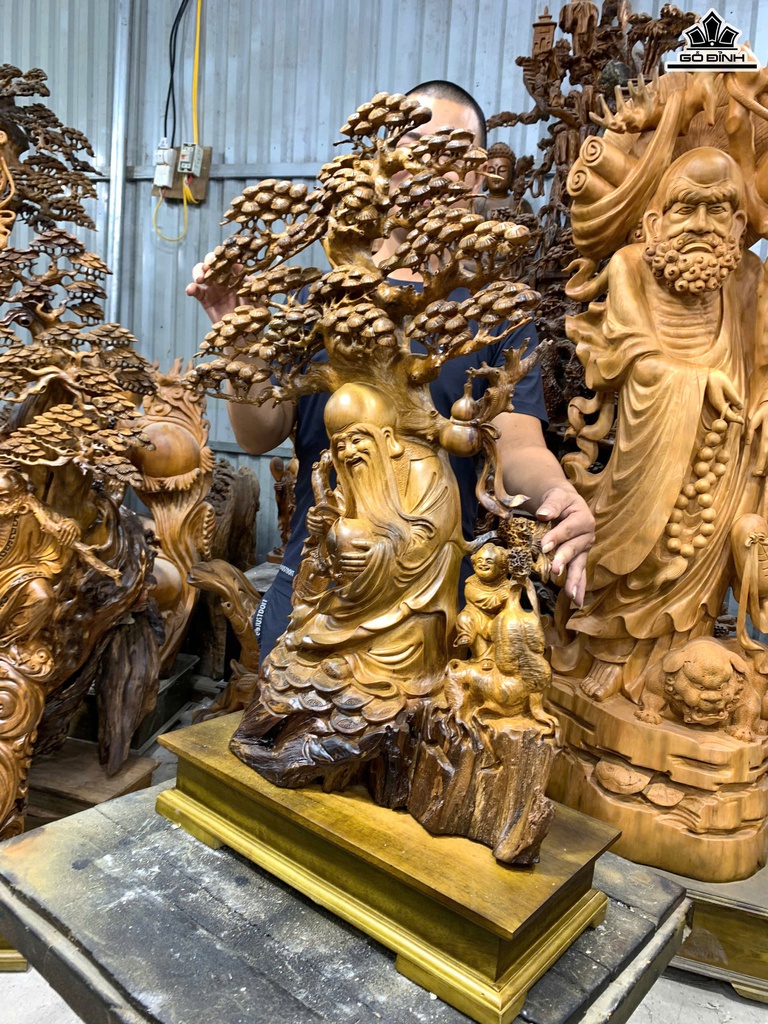 Tượng Ông Thọ Gỗ Bách Xanh Cao 80 Ngang 50 Sâu 23 (cm) - Cả Kỷ Cao 90