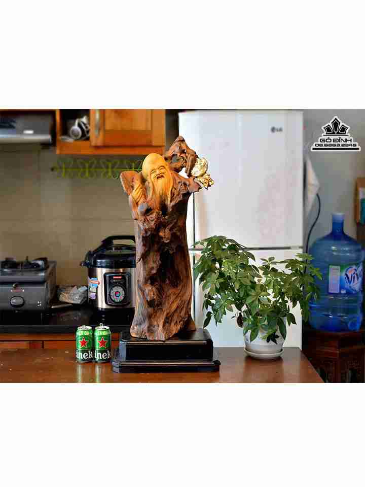 Tượng Ông Thọ Gỗ Lũa Bách Xanh Cao 75 Ngang 35 Dày 20 (cm) ( cả kỷ )