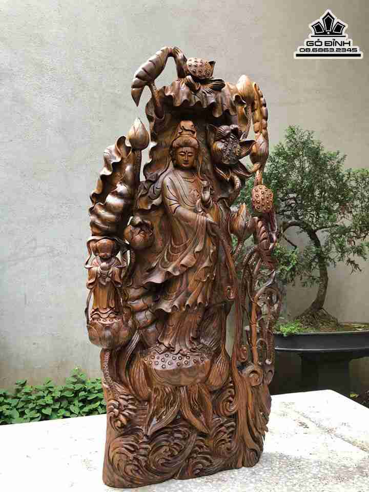 Tượng Phật Bà Quan Âm Gỗ Bách Xanh Cao 90 Ngang 45 Sâu 20 (cm)