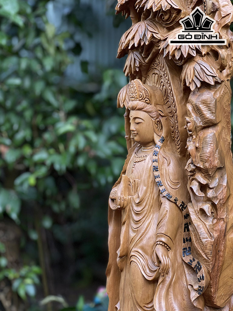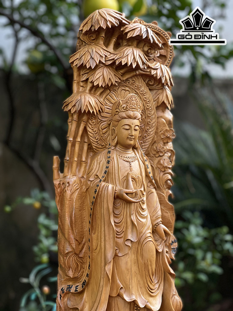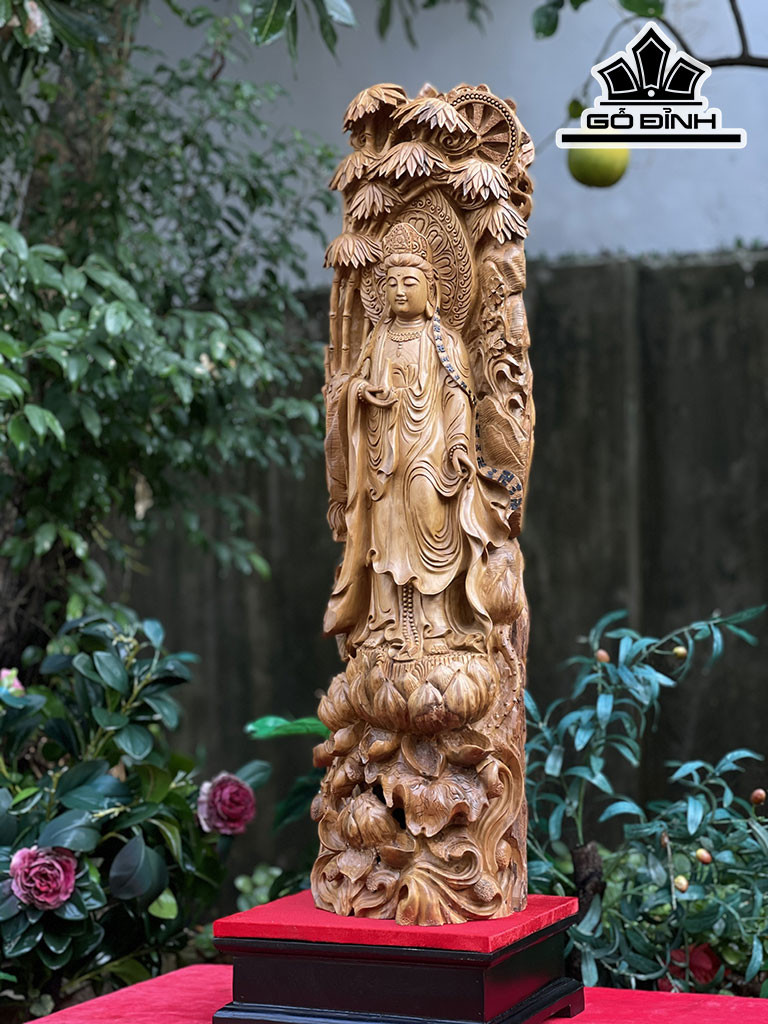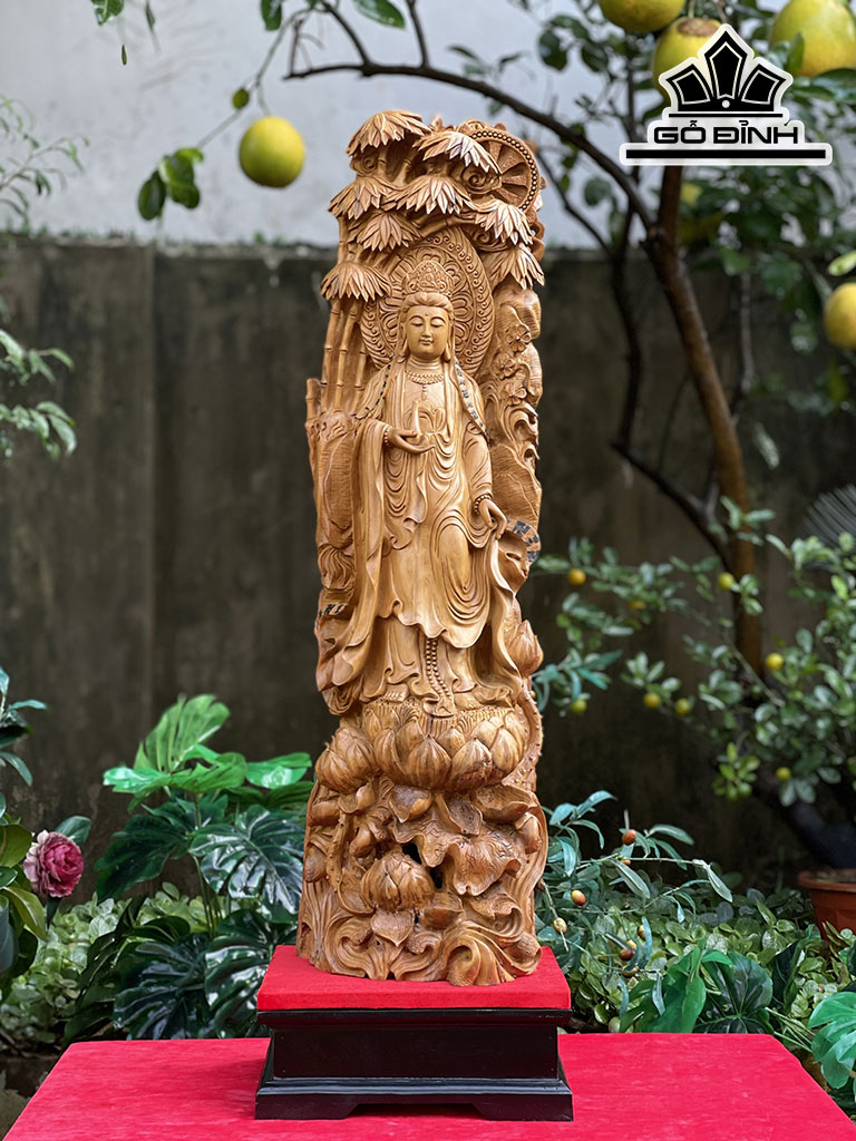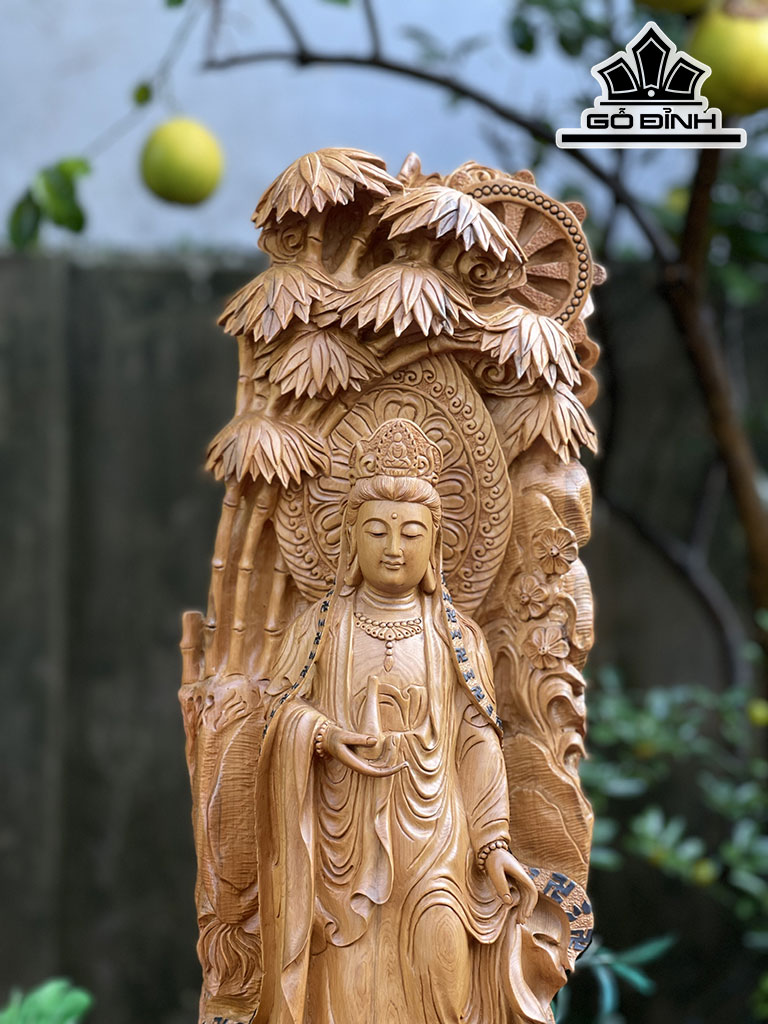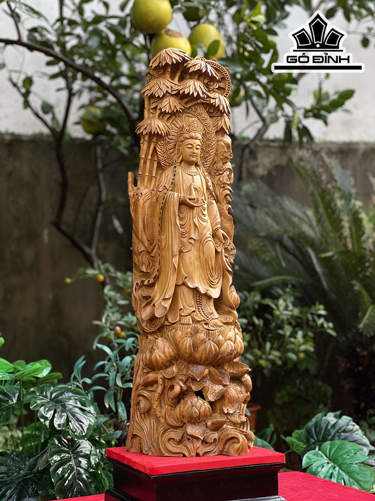 Tượng Phật Bà Quan Âm Gỗ Bách Xanh Cao 88 Ngang 26 Sâu 25 (cm)