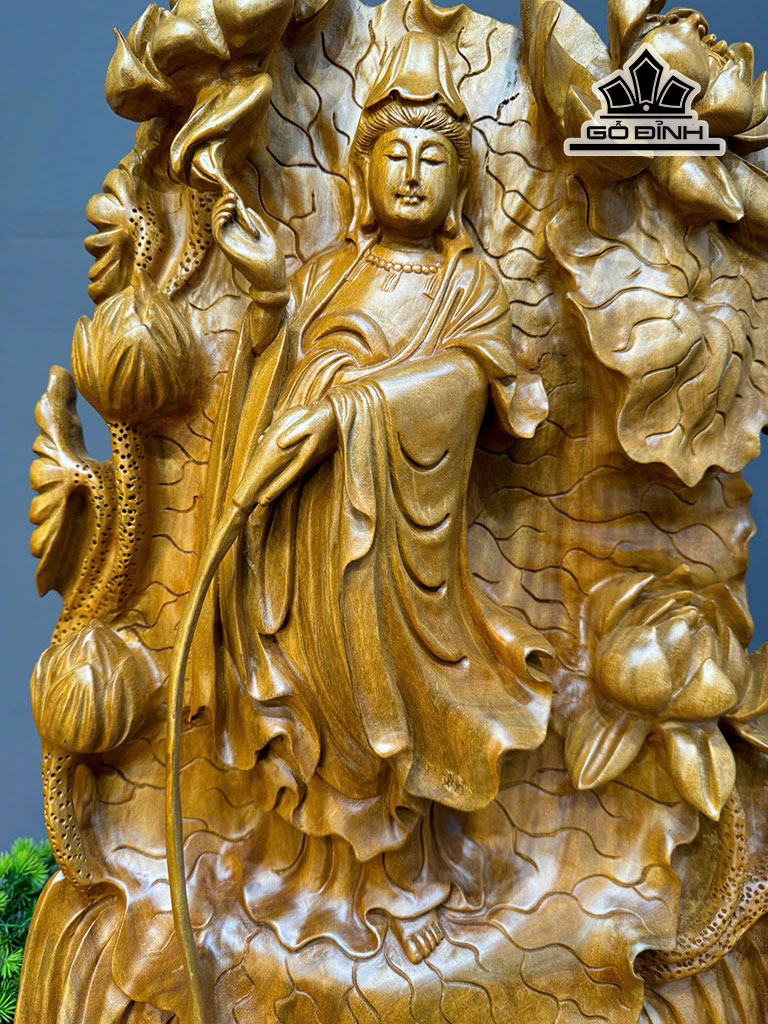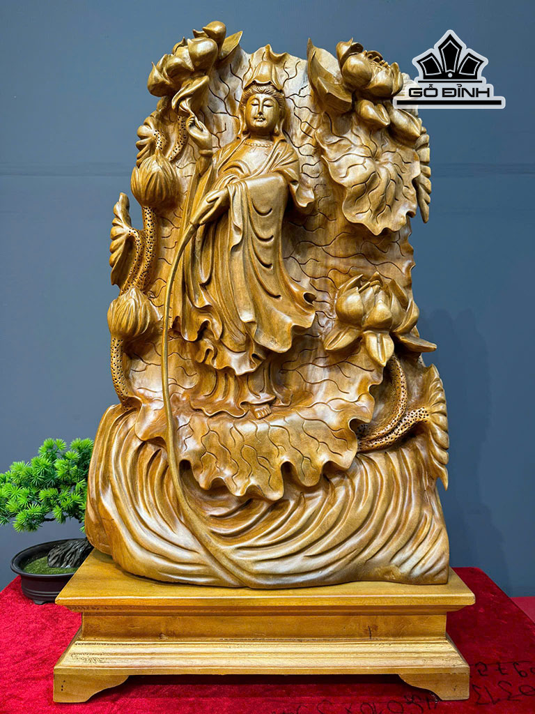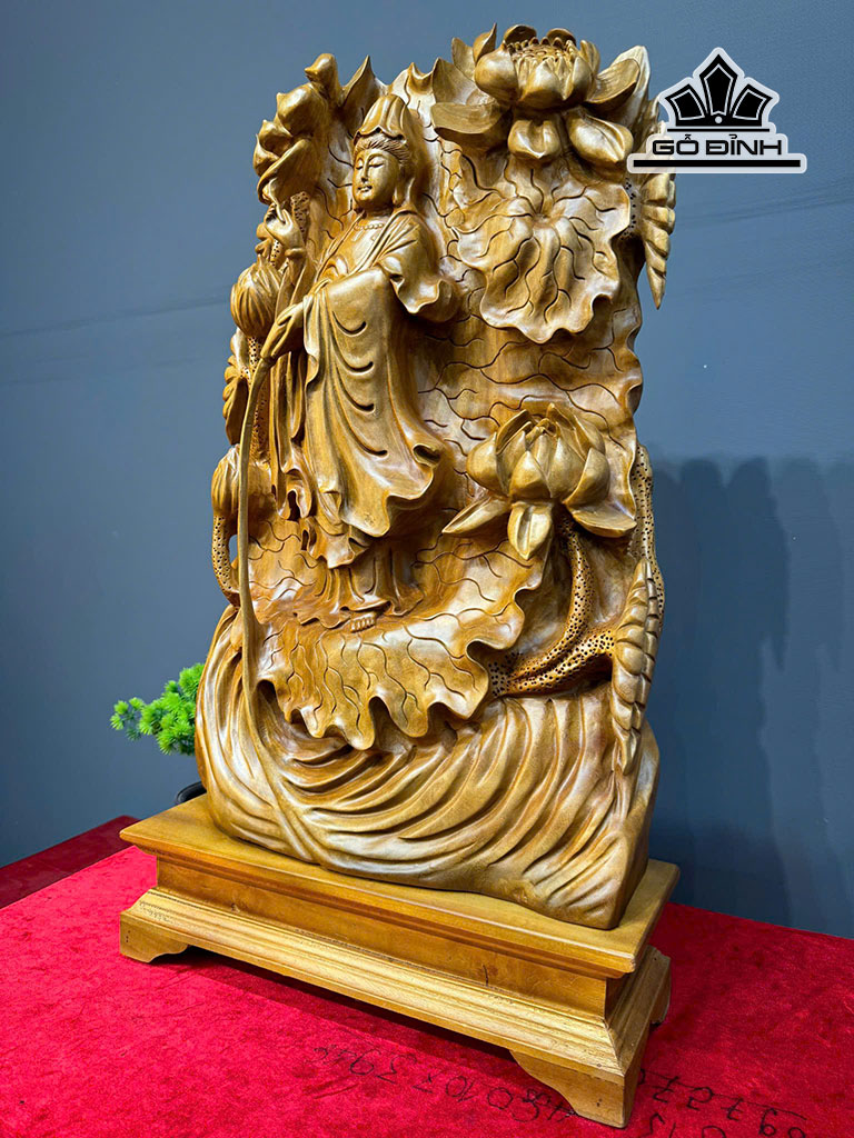 Tượng Phật Bà Quan Âm Gỗ Xá Xị Cao Cả Kỷ 75 - Riêng Kỷ Cao 11 Ngang 42 Sâu 15 (cm)