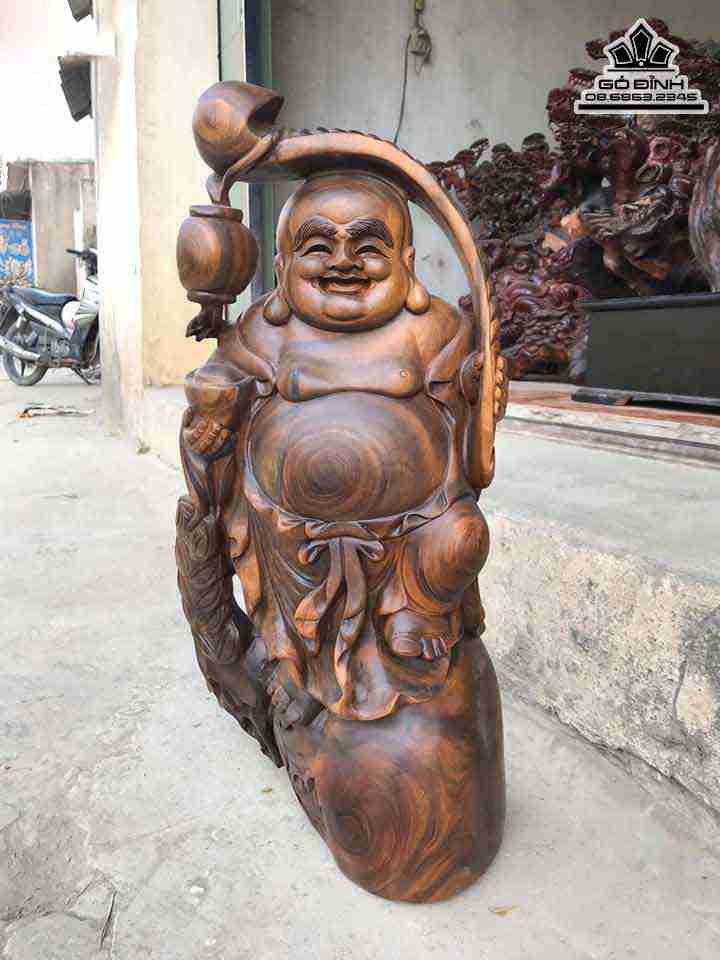Tượng Phật Di Lặc Cầm Gậy Như Ý Gỗ Bách Xanh Cao 57 Rộng 28 Dày 21 (cm)