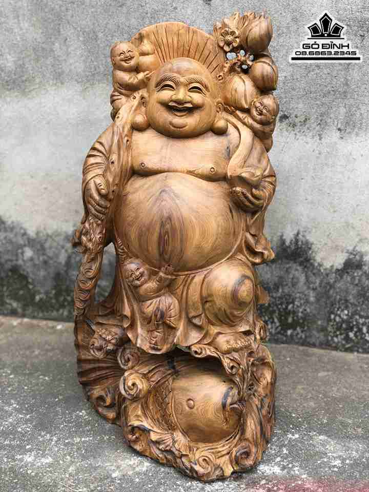 Tượng Phật Di Lặc Cưỡi Cá Chép Gỗ Bách Xanh Cao 58 Rộng 32 Dày 22 (cm)