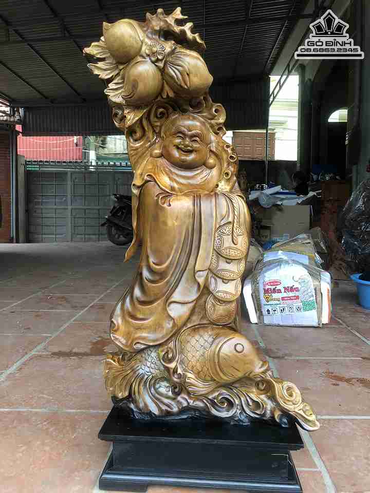 Tượng Phật Di Lặc Cưỡi Cá Chép Gỗ Bách Xanh Cao 75 Ngang 40 Sâu 18 (cm)