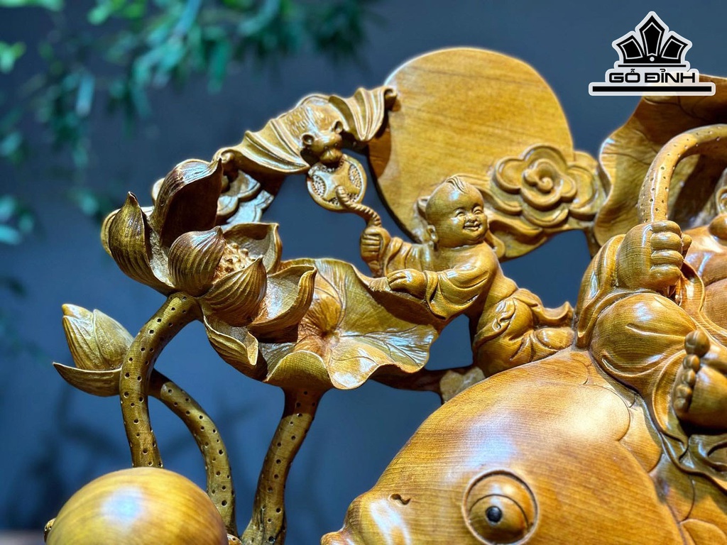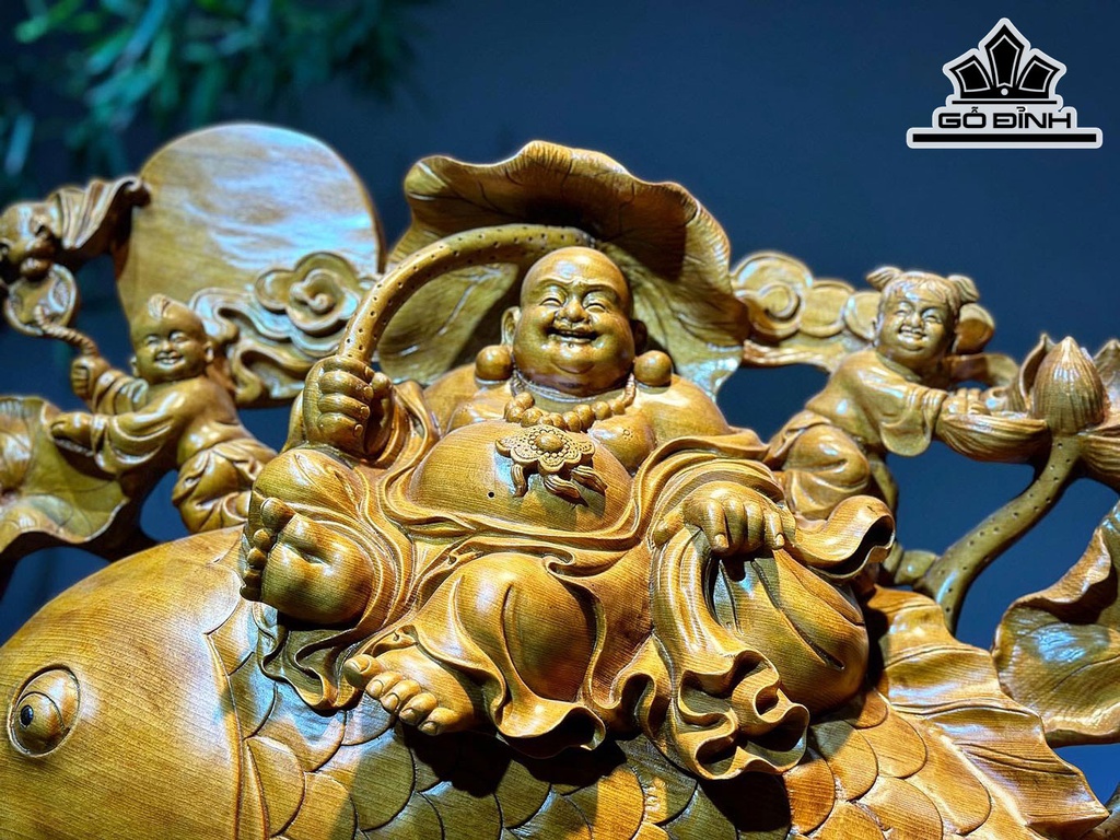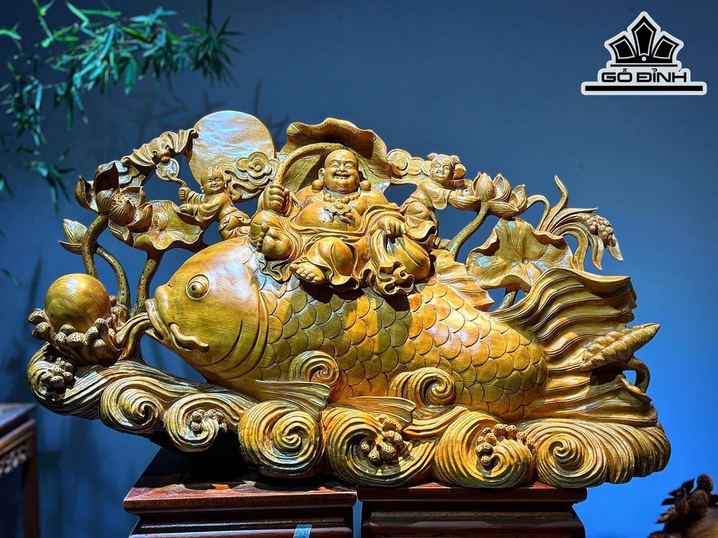 Tượng Phật Di Lặc Cưỡi Cá Chép Gỗ Ngọc Am Ngang 88 Cao 50 Sâu 24 (cm)
