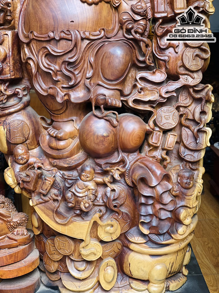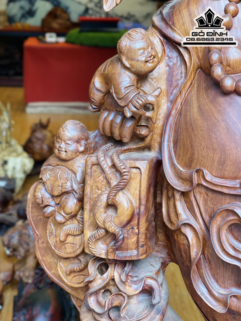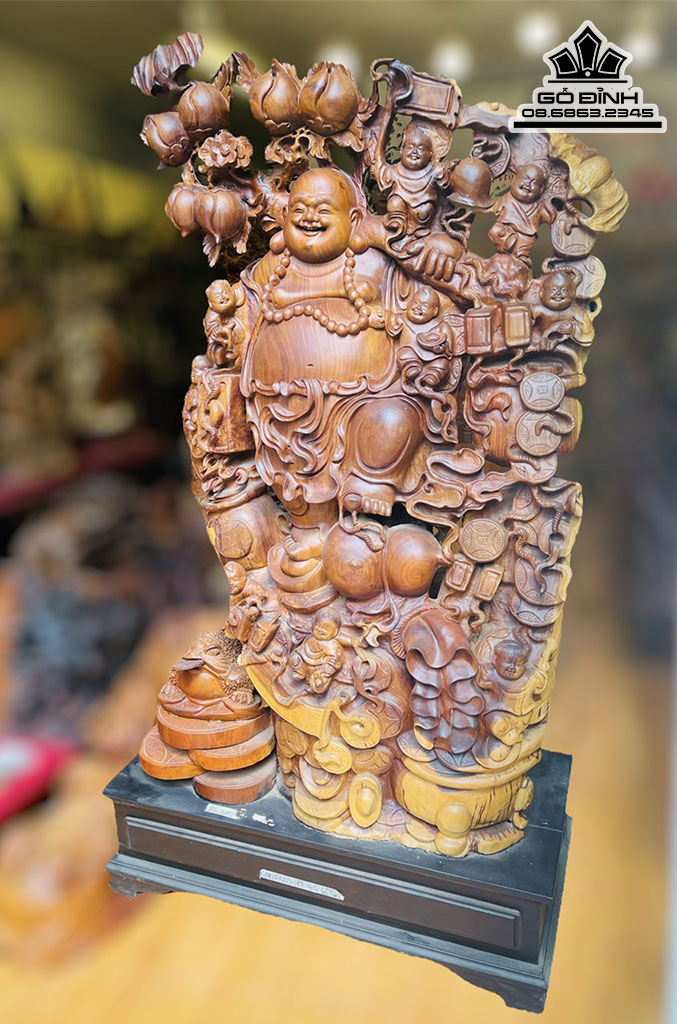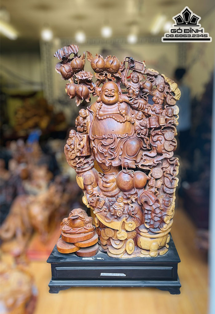 Tượng Phật Di Lặc Cửu Phúc Gỗ Hương Việt Cao 120 Ngang 75 Sâu 40 Cả Kỷ 140 (cm)