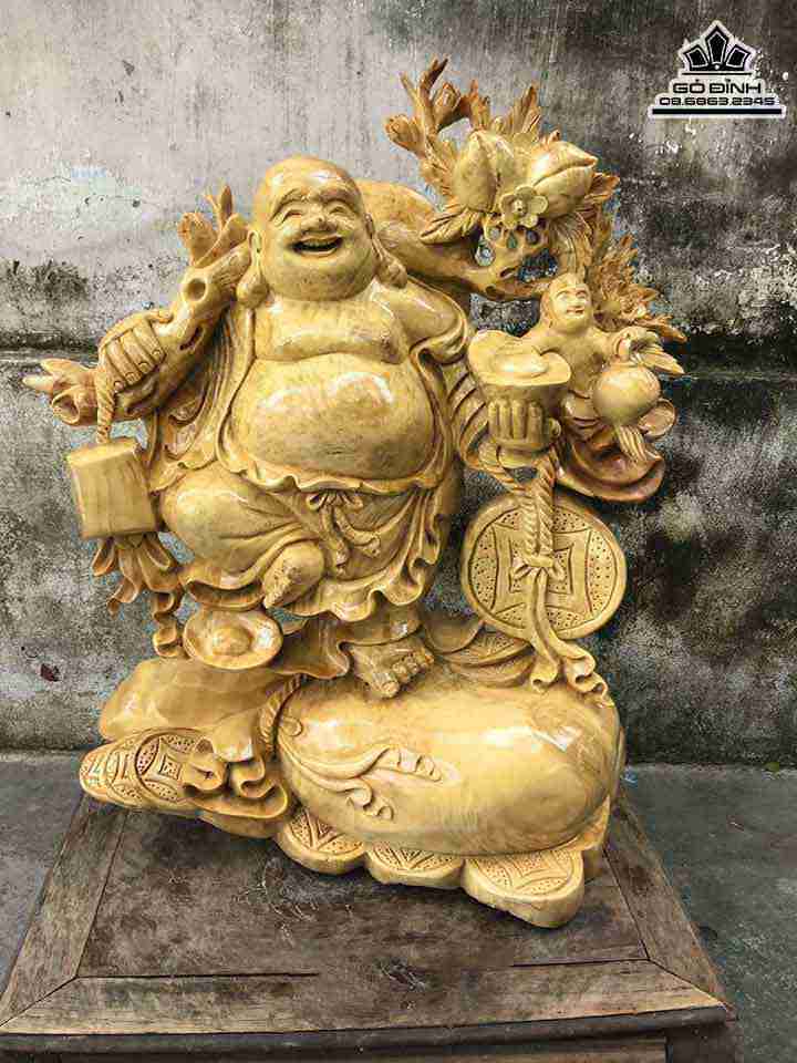 Tượng Phật Di Lặc Đứng Bao Tiền Gỗ Nu Nghiến Cao 60 Rộng 55 Dày 23 (cm)