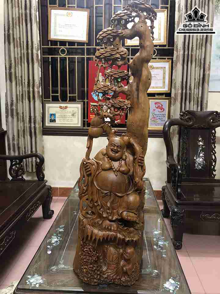 Tượng Phật Di Lặc Đứng Gốc Tùng Gỗ Bách Xanh Cao 90 Rộng 23 Sâu 21 (cm)