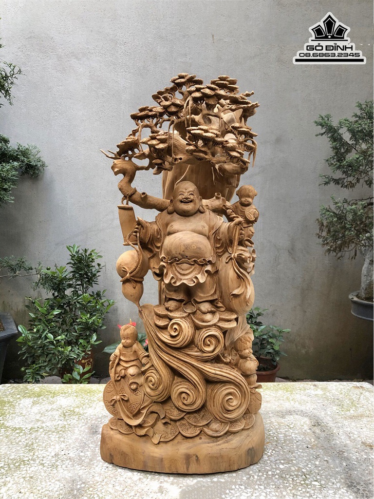 Tượng Phật Di Lặc Đừng Gốc Tùng Gỗ Ngọc Am Cao 86 Ngang 36 Sâu 30 (cm)