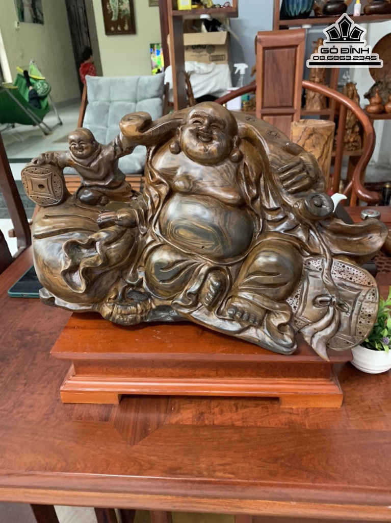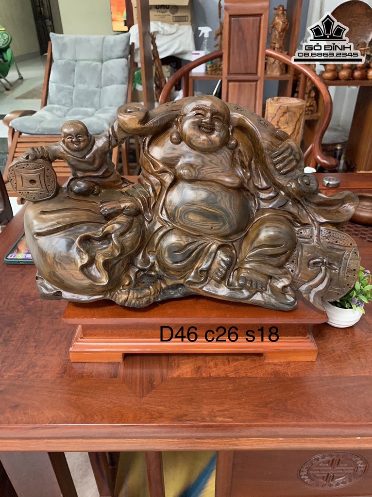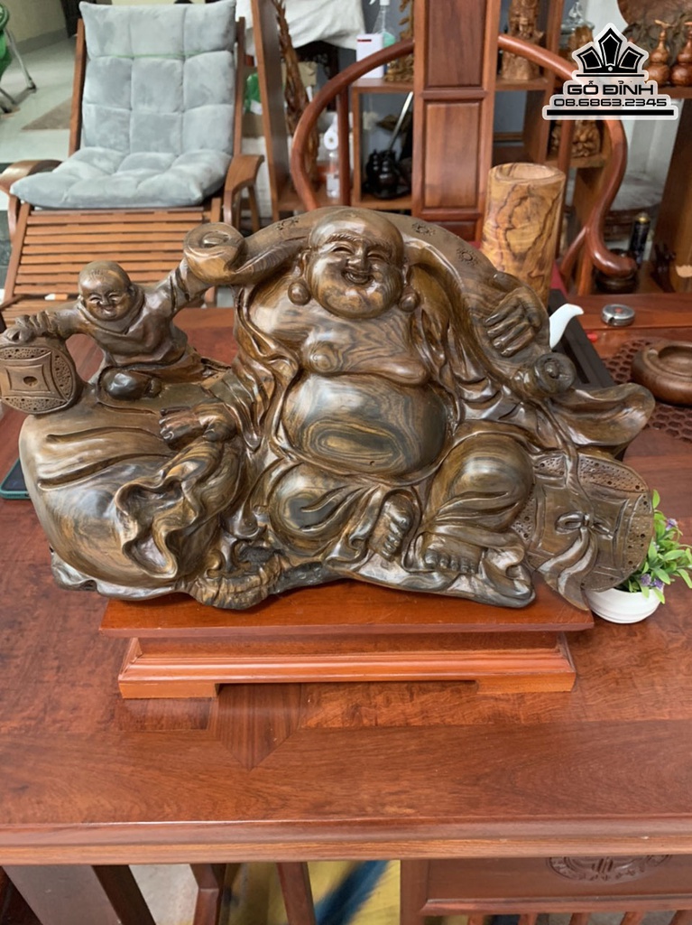Tượng Phật Di Lặc Gỗ Bách Xanh Cao 26 Ngang 46 Sâu 18 (cm)
