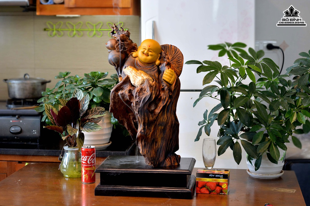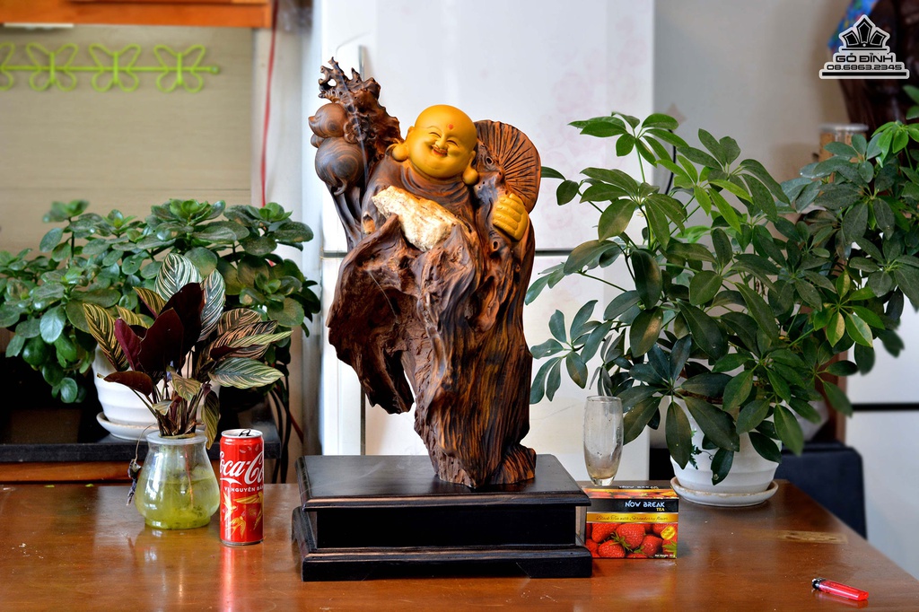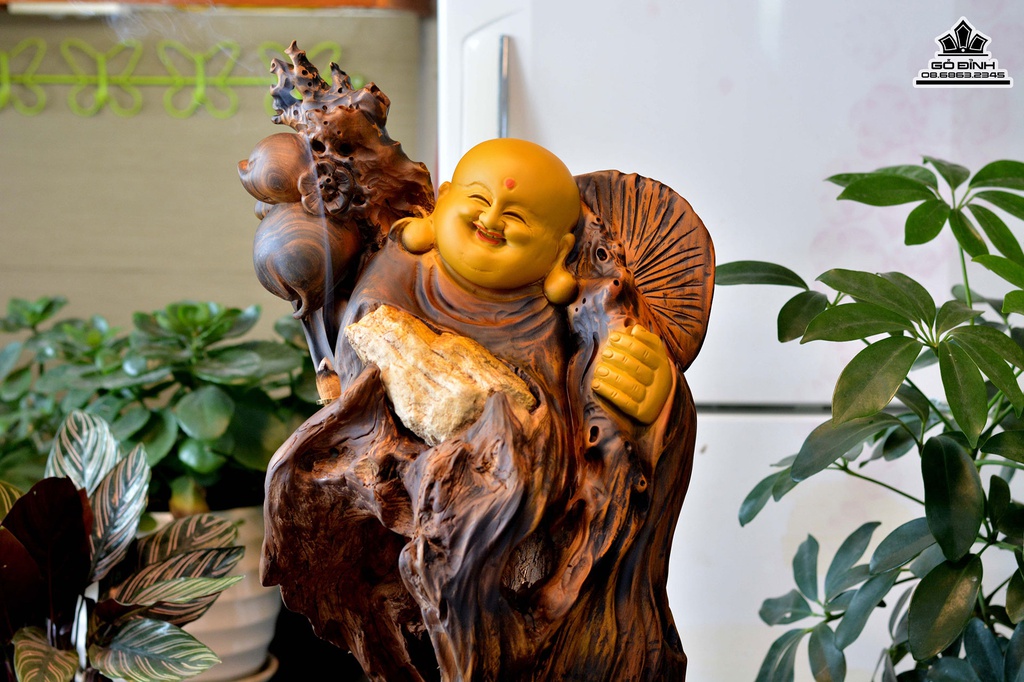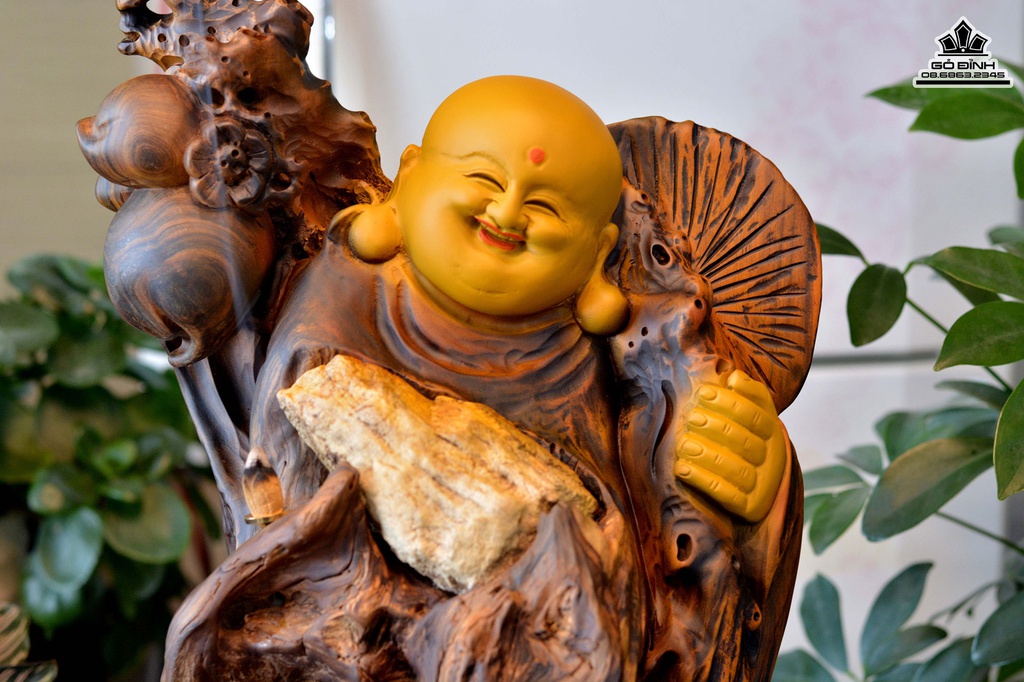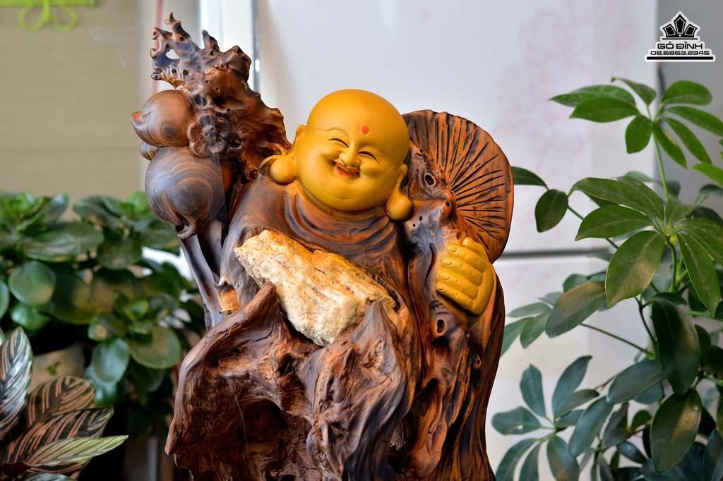 Tượng Phật Di Lặc Gỗ Bách Xanh Ôm Đá