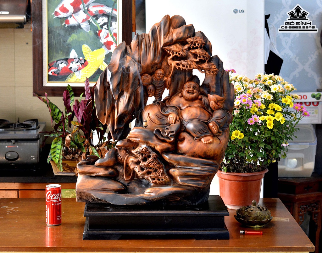 Tượng Phật Di Lặc Gỗ Nu Xá Xị Cao 79 Ngang 55 Sâu 20 Kỷ Cao 10 (cm)