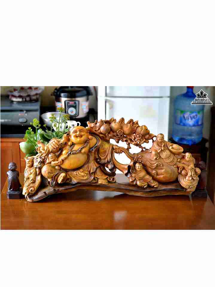 Tượng Phật Di Lặc Kéo Bao Tiền gỗ bách xanh ngang 1m cao 46 dày 25 (cm)