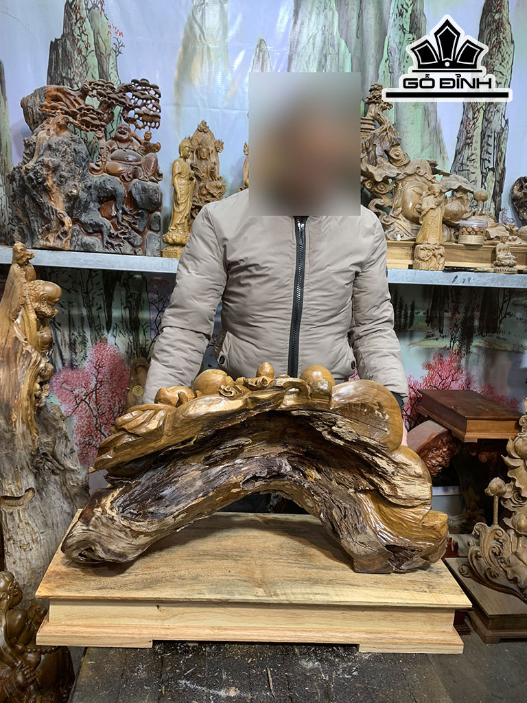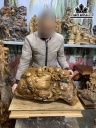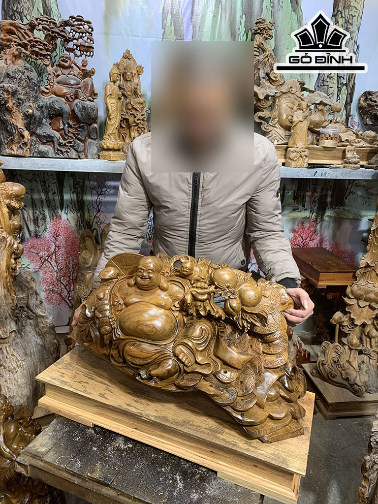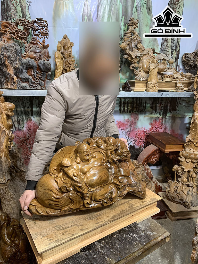 Tượng Phật Di Lặc Kéo Bao Tiền Gỗ Bách Xanh Cao Cả Kỷ 48 Ngang 73 Sâu 35 (cm)
