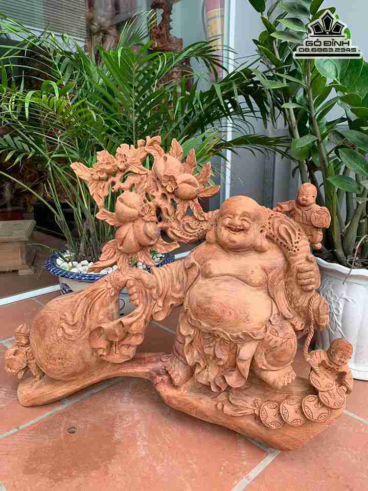 Tượng Phật Di Lặc Kéo Bao Tiền Gỗ Hương Cao 59 Ngang 72 Sâu 21 (cm)