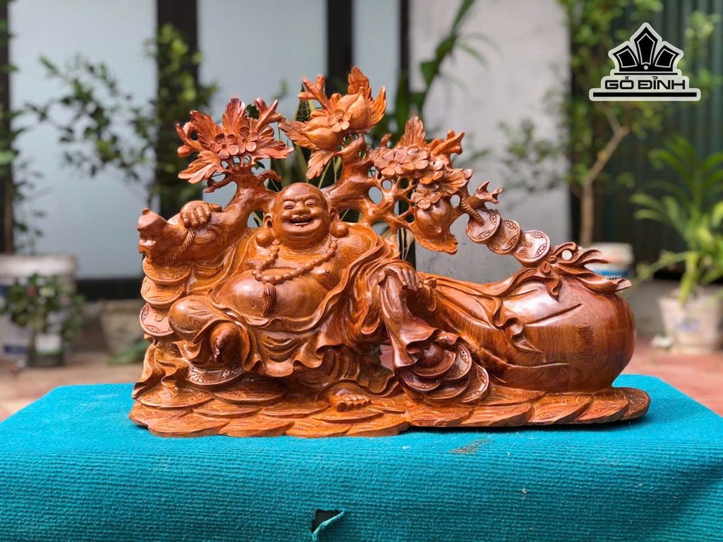 Tượng Phật Di Lặc Kéo Bao Tiền Gỗ Hương Cao 40 Ngang 59 Sâu 22 (cm)