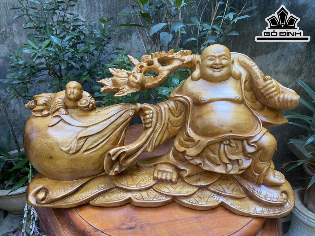 Tượng Phật Di Lặc Kéo Bao Tiền Gỗ Ngọc Am Cao 30 Ngang 57 Sâu 16 (cm)