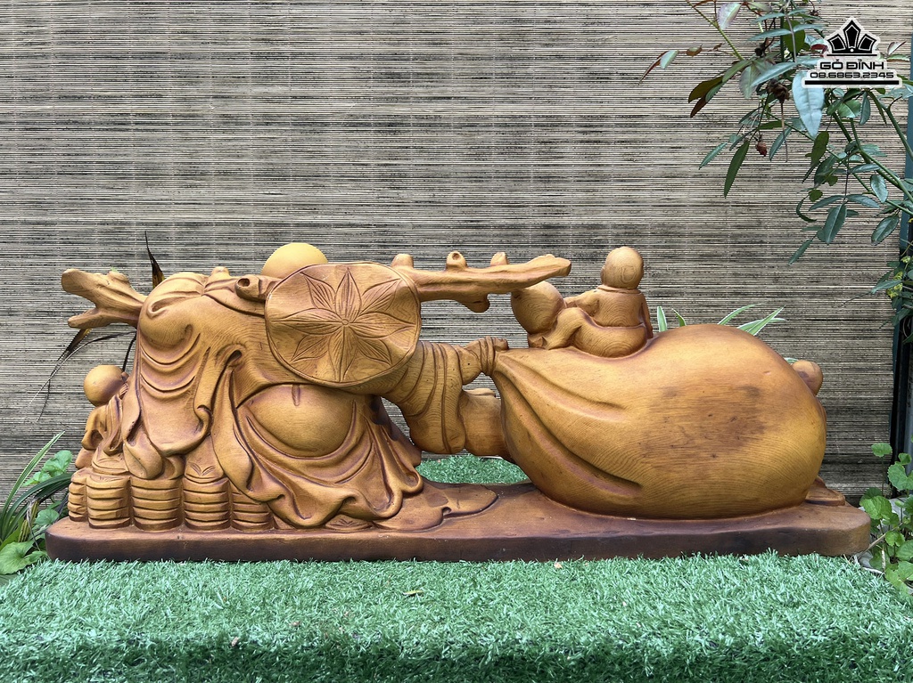 Tượng Phật Di Lặc Kéo Bao Tiền Gỗ Pơ Mu Cao 23 Ngang 71 Sâu 16 (cm)