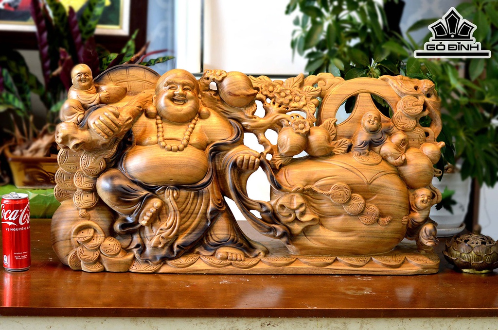 Tượng Phật Di Lặc Kéo Bao Tiền Gỗ Xá Xị Cao 39 Ngang 80 Sâu 13 (cm)