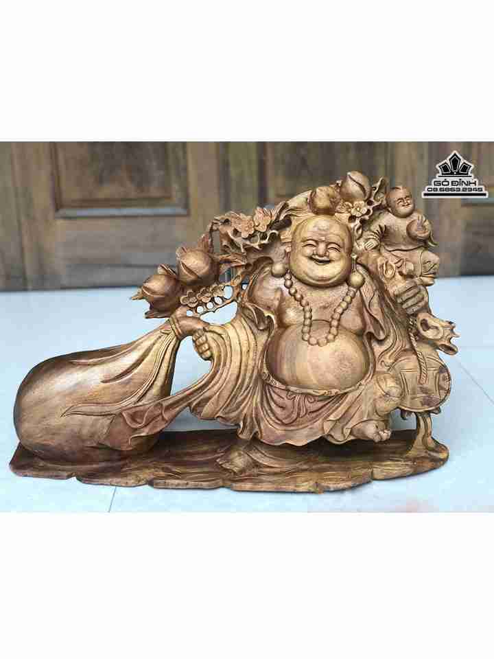 Tượng Phật Di Lặc Kéo Bao Tiền Gỗ Xá Xị ( Gù Hương ) Cao 39 Ngang 63 Sâu 19 (cm)