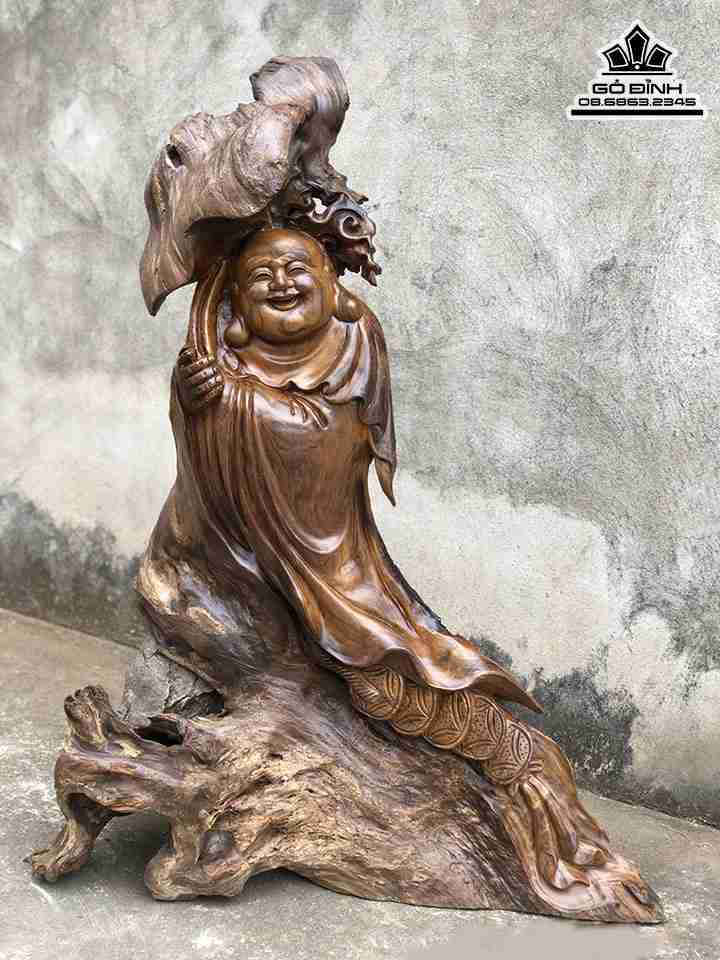 Tượng Phật Di Lặc Lá Sen Gỗ Bách Xanh Cao 92 Ngang 72 Sâu 26 (cm)