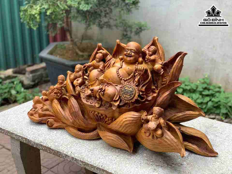 Tượng Phật Di Lặc Ngồi Đài Sen Gỗ Xá Xị ( Gù Hương ) Cao 45 Ngang 98 Sâu 41 (cm)