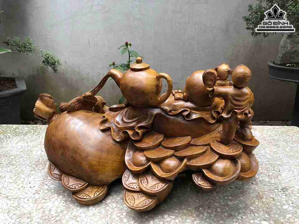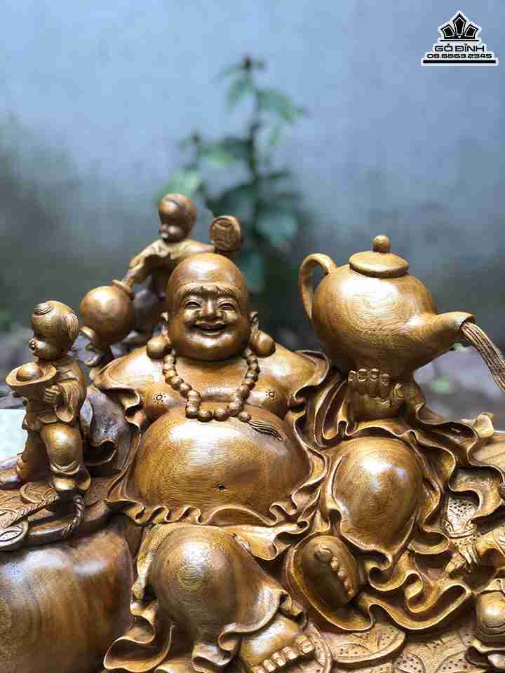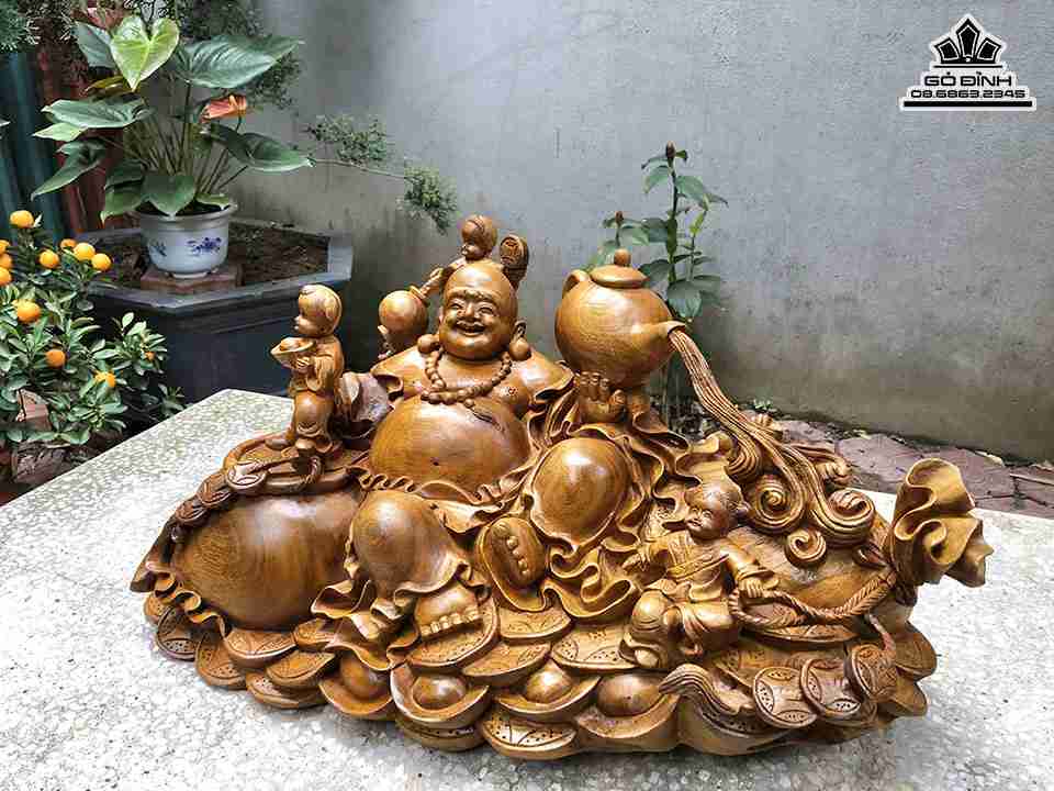 Tượng Phật Di Lặc Ngồi Bao Tiền Gỗ Xá Xị ( Gù Hương ) Cao 32 Rộng 60 Dày 42 (cm)