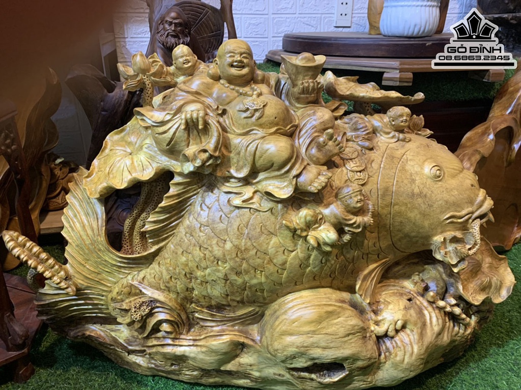Tượng Phật Di Lặc Ngồi Cá Chép Gỗ Nu Kháo