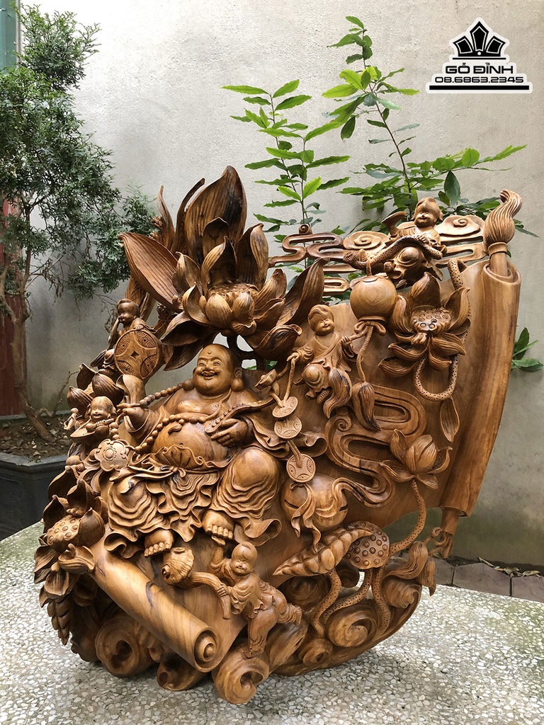 Tượng Phật Di Lặc Ngồi Đài Sen Gỗ Bách Xanh Cao 75 Ngang 72 Sâu 35 (cm)
