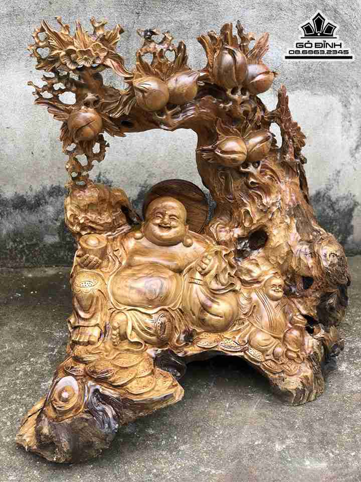 Tượng Phật Di Lặc Ngồi Gốc Đào Gỗ Bách Xanh Cao 59 Ngang 55 Sâu 33 (cm)