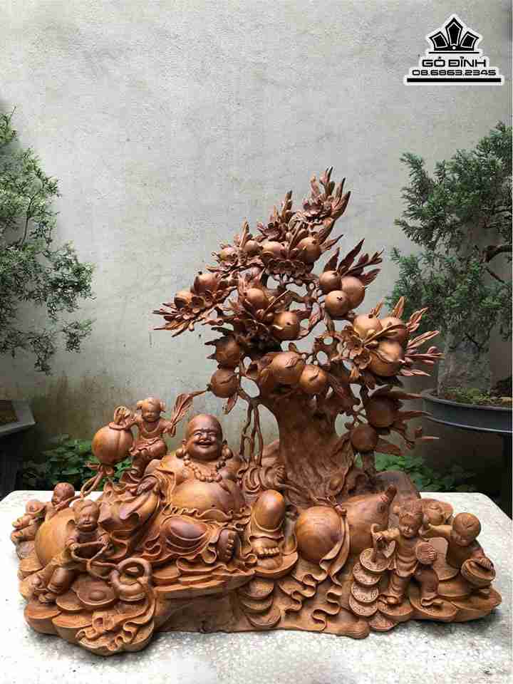 Tượng Phật Di Lặc Ngồi Gốc Đào Gỗ Xá Xị ( Gù Hương ) Cao 75 Ngang 87 Sâu 50 (cm)