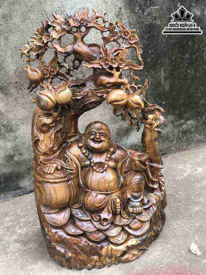 Tượng Phật Di Lặc Ngồi Gốc Đào Gỗ Xá Xị ( Gù Hương ) Cao 64 Rộng 38 Dày 19 (cm)