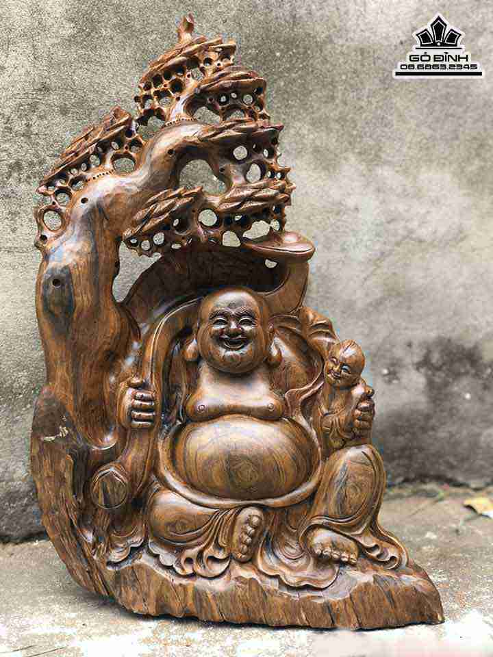 Tượng Phật Di Lặc Ngồi Gốc Tùng Gỗ Bách Xanh Cao 48 Rộng 32 Dày 12 (cm)