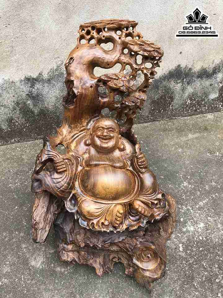 Tượng Phật Di Lặc Ngồi Gốc Tùng Gỗ Bách Xanh Cao 38 Rộng 29 Dày 30 (cm)
