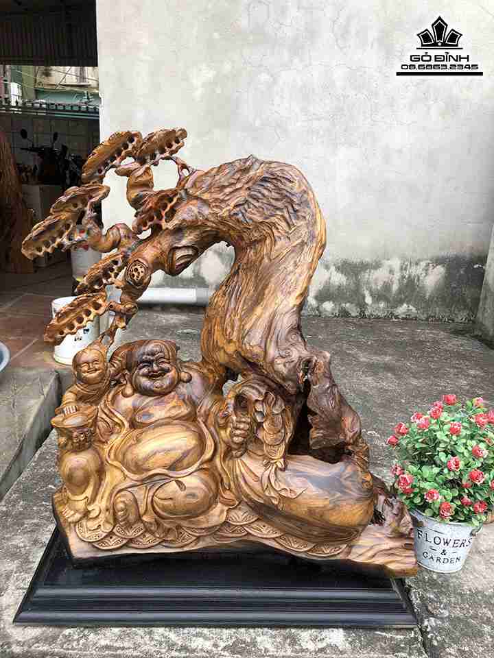 Tượng Phật Di Lặc Ngồi Gốc Tùng Gỗ Bách Xanh Cao 51 Ngang 41 Sâu 22 (cm)