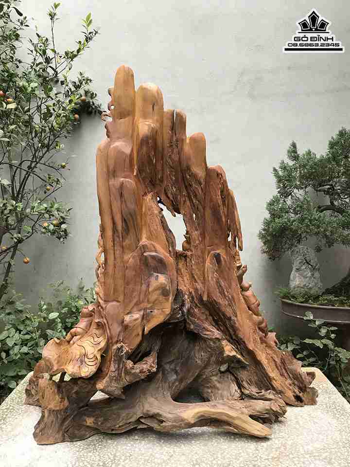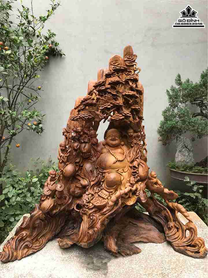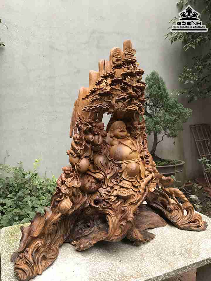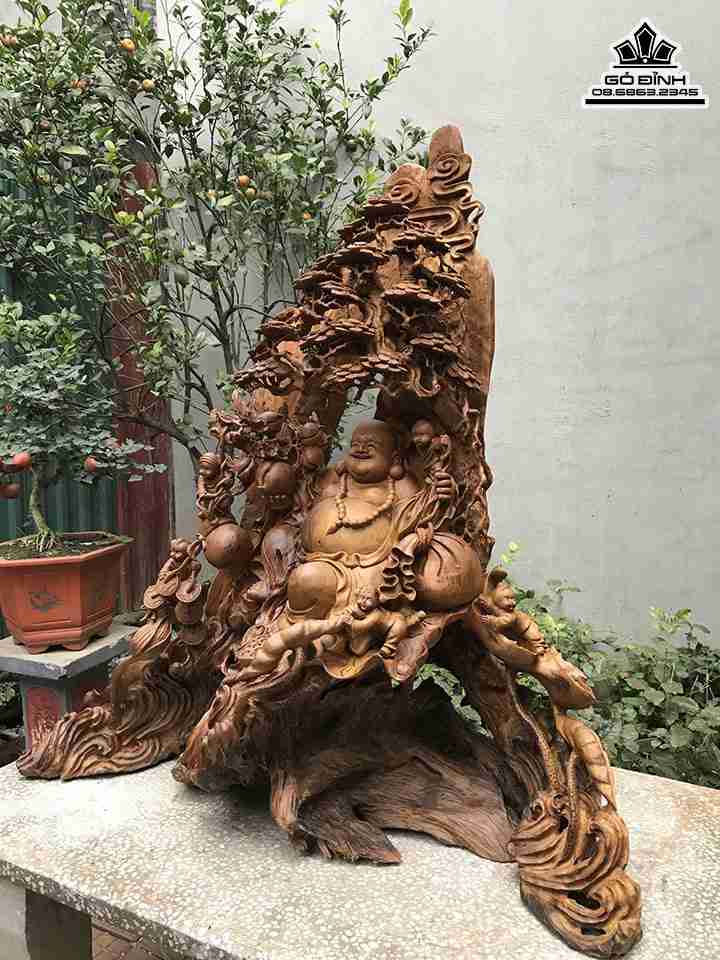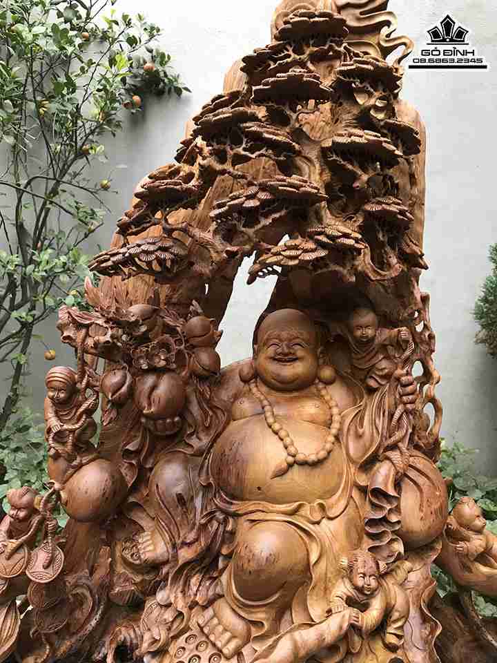 Tượng Phật Di Lặc Ngồi Gốc Tùng Gỗ Bách Xanh Cao 110 Ngang 103 Sâu 43 (cm)